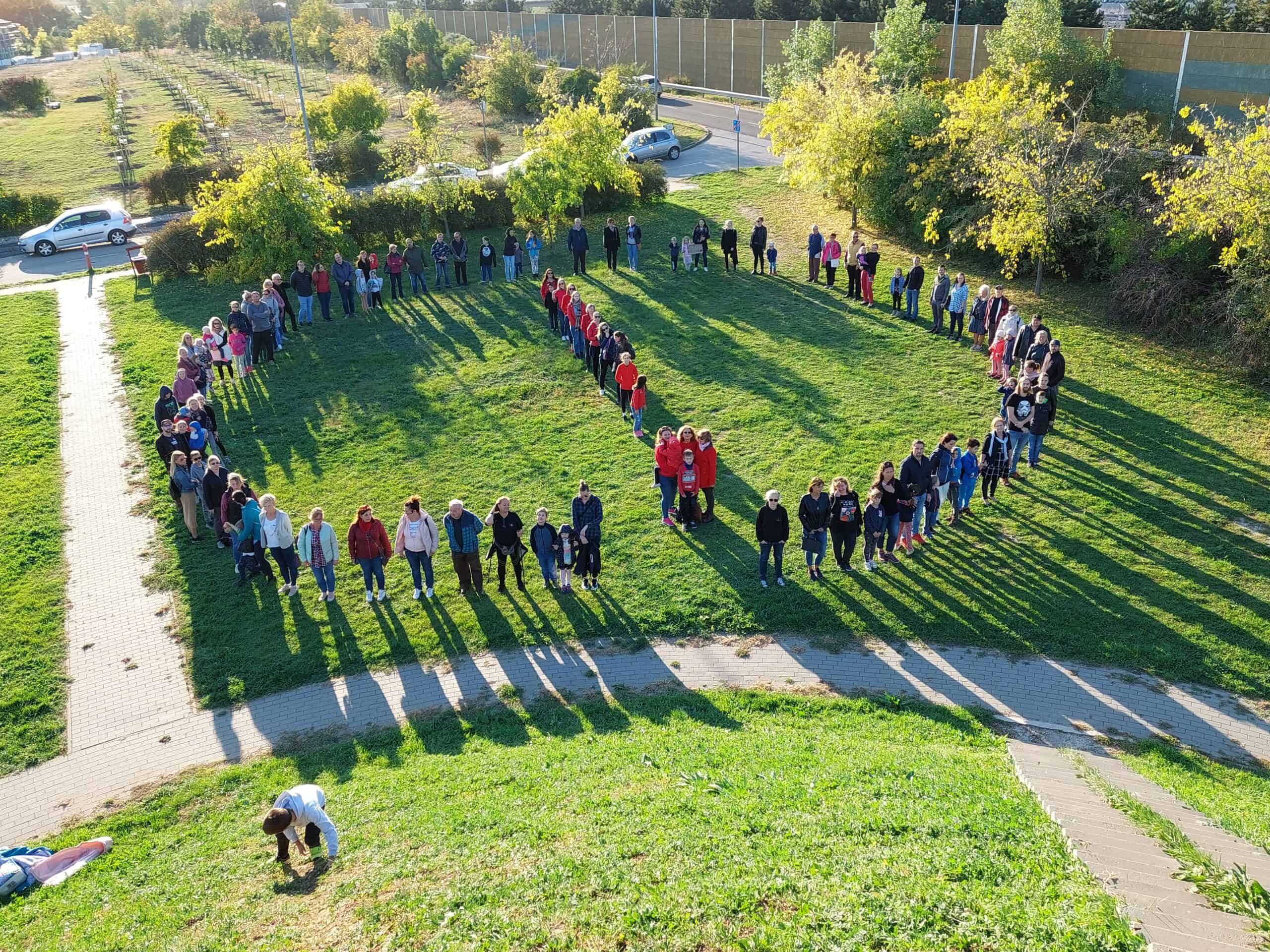 Közel százan a felkiáltójeles szimbólumot megalkotva, közös énekléssel támogatták a pedagógusok ügyét a diósdi országzászlónál.