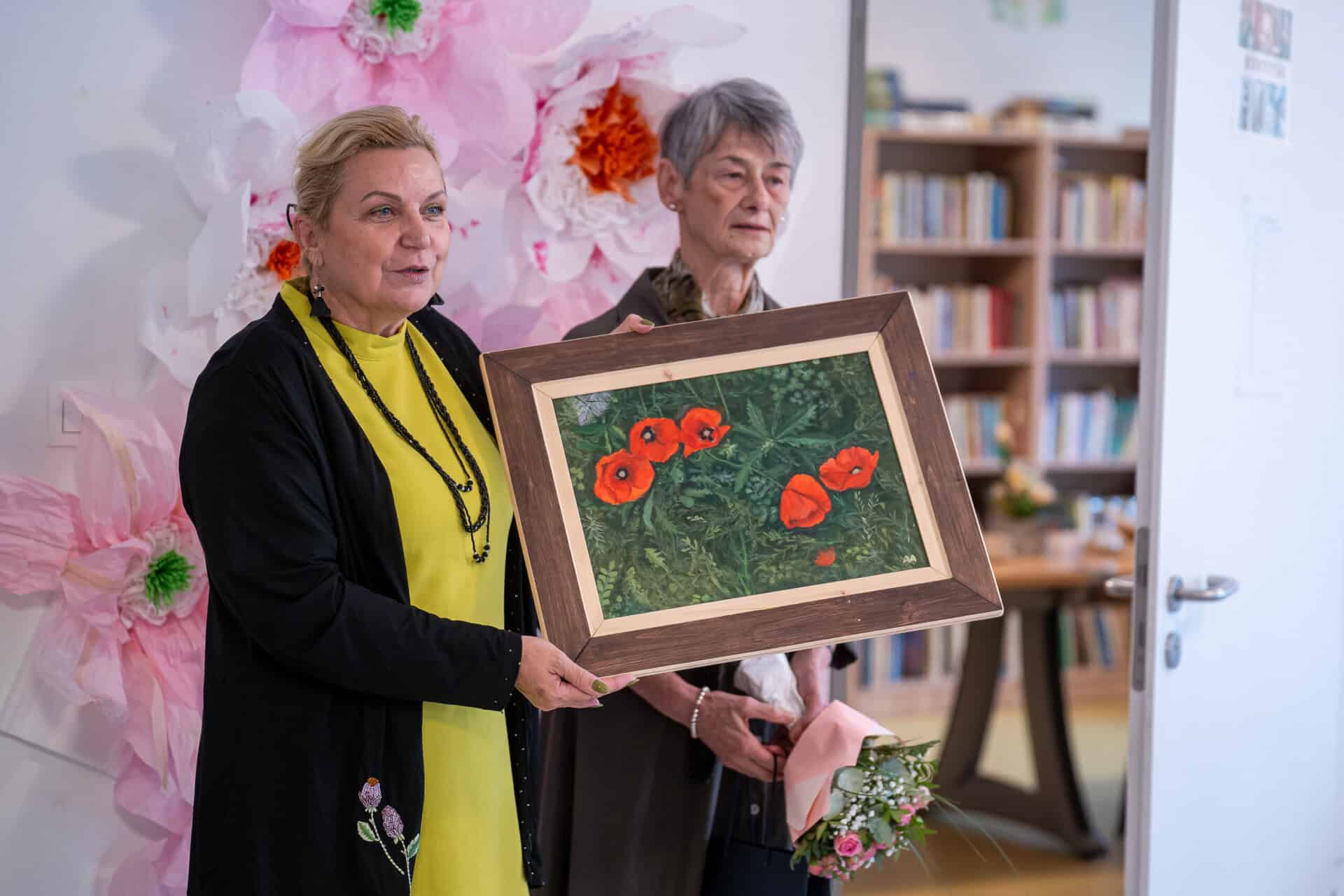 A pipacsokat ábrázoló festményt Varga Virág, az idősotthon vezetője vette át, aki azt kívánta, hogy az otthon lakói tudjanak töltekezni a kiállított képek látványával, színeivel, a belőlük áradó harmóniával.
